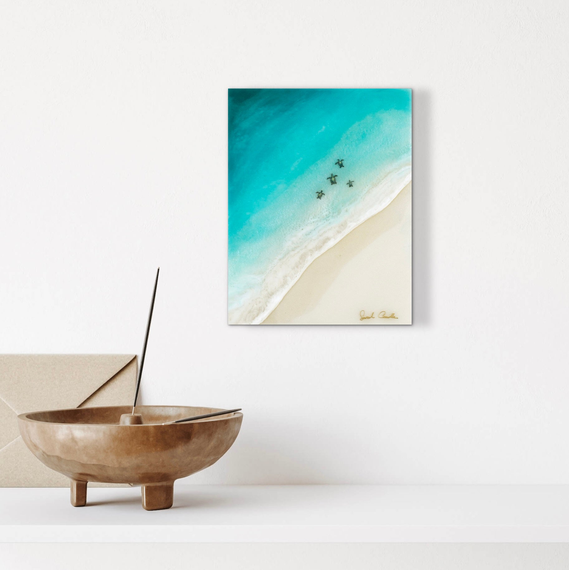 まるでハワイの海をそのまま切り取ったような、透明感あふれる美しいアクリルアート。アーティストSarah Caudleが描く幻想的な海の世界を、高精細にプリントし、上質なアクリルパネルに丁寧に貼り合わせました。